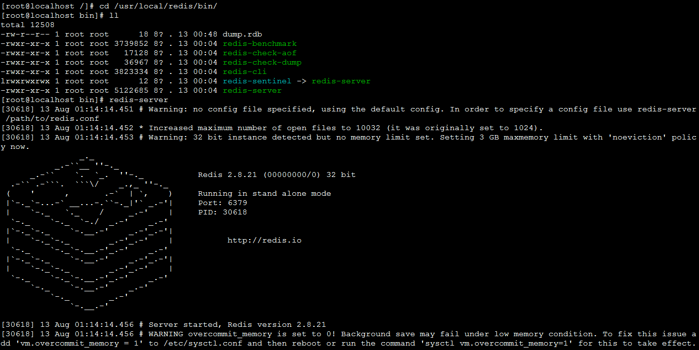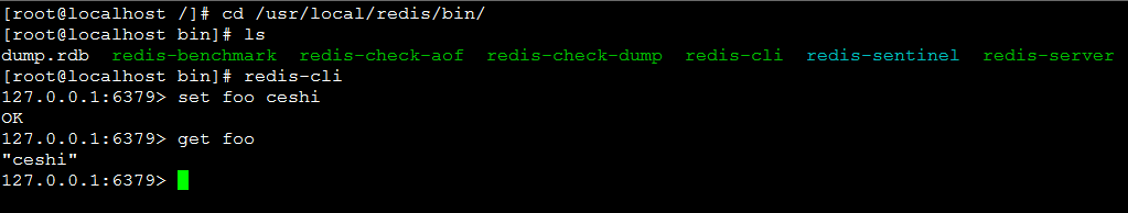 [root@localhost /]# cd /usr/local/redis/bin/ [root@localhost bin]# redis-cli 127.0.0.1:6379> set foo ceshi OK 127.0.0.1:6379> get foo "ceshi" 127.0.0.1:6379>