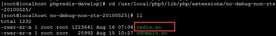 8、执行 cd /usr/local/php5/lib/php/extensions/no-debug-non-zts-20100525/ 目录下会有redis.so
