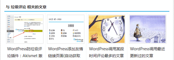 <h3>相关文章</h3> <ul class="related_img"> <?php $post_num = 4; $exclude_id = $post->ID; $posttags = get_the_tags(); $i = 0; if ( $posttags ) { $tags = ''; foreach ( $posttags as $tag ) $tags .= $tag->term_id . ','; $args = array( 'post_status' => 'publish', 'tag__in' => explode(',', $tags), 'post__not_in' => explode(',', $exclude_id), 'caller_get_posts' => 1, 'orderby' => 'comment_date', 'posts_per_page' => $post_num ); query_posts($args); while( have_posts() ) { the_post(); ?> <li class="related_box" > <div class="r_pic"> <a href="<?php the_permalink(); ?>" title="<?php the_title(); ?>" target="_blank"> <img src="<?php echo post_thumbnail_src(); ?>" alt="<?php the_title(); ?>" class="thumbnail" /> </a> </div> <div class="r_title"><a href="<?php the_permalink(); ?>" title="<?php the_title(); ?>" target="_blank" rel="bookmark"><?php the_title(); ?></a></div> </li> <?php $exclude_id .= ',' . $post->ID; $i ++; } wp_reset_query(); } if ( $i < $post_num ) { $cats = ''; foreach ( get_the_category() as $cat ) $cats .= $cat->cat_ID . ','; $args = array( 'category__in' => explode(',', $cats), 'post__not_in' => explode(',', $exclude_id), 'caller_get_posts' => 1, 'orderby' => 'comment_date', 'posts_per_page' => $post_num - $i ); query_posts($args); while( have_posts() ) { the_post(); ?> <li class="related_box" > <div class="r_pic"> <a href="<?php the_permalink(); ?>" title="<?php the_title(); ?>" target="_blank"> <img src="<?php echo post_thumbnail_src(); ?>" alt="<?php the_title(); ?>" class="thumbnail" /> </a> </div> <div class="r_title"><a href="<?php the_permalink(); ?>" title="<?php the_title(); ?>" target="_blank" rel="bookmark"><?php the_title(); ?></a></div> </li> <?php $i++; } wp_reset_query(); } if ( $i == 0 ) echo '<div class="r_title">没有相关文章!</div>'; ?> </ul>